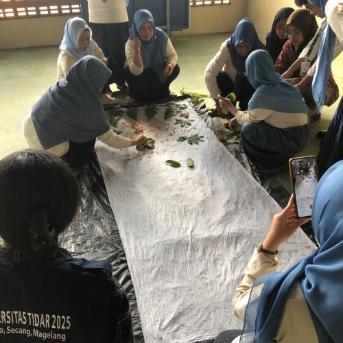 Tahap kedua adalah pelatihan langsung dengan metode demonstrasi dan praktik. Peserta diajak membuat kain ecoprint menggunakan metode steam, yaitu proses pengukusan kain yang sudah ditata dengan motif daun dan dibungkus rapat. Peserta juga belajar membuat totebag ecoprint dengan metode pounding, yaitu teknik memindahkan pigmen daun ke kain dengan cara dipukul secara manual.