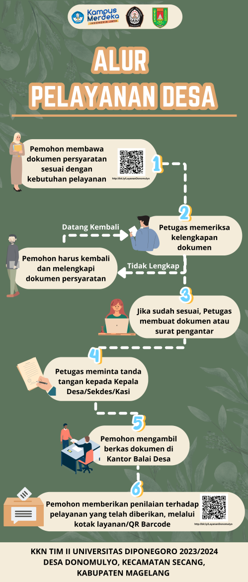 Pelayanan desa merupakan pelayanan yang disedikan oleh Pemerintah Desa yang bertujuan untuk meningkatkan kesejahteraan masyarakat dan mendorong kemajuan desa. Salah satu jenis pelayanan yang disediakan oleh Desa Donomulyo adalah pelayanan administratif yaitu pelayanan pencatatan dan pengambilan keputusan yang menghasilkan produk berupa dokumen seperti Akta, Kartu Keluarga, dan lain sebagainya.